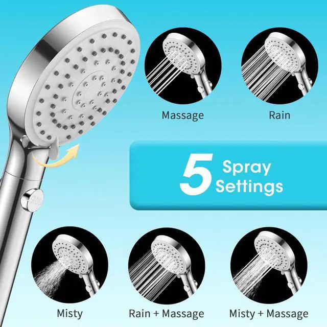5 SPRAY MODES - FASDUNT handheld shower head adopt 5 Spray Settings, including Misty, Rain + Massage, Massage, Rain, Misty + Massage. Simply rotate the handle on the shower head panel to switch mode. Each mode brings you different shower experience