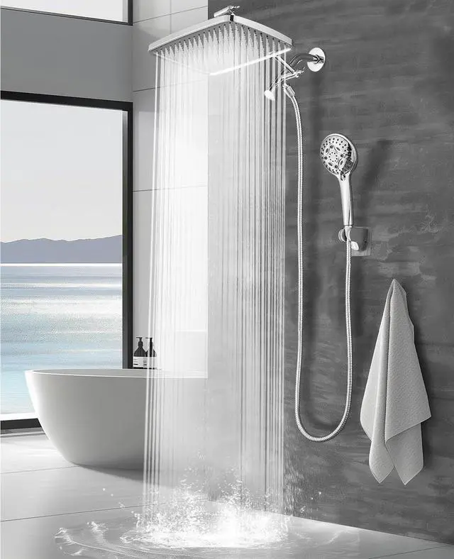 12" Rain Shower Head12" square stainless steel shower head + 8-mode shower head, large panel, allowing you to enjoy the perfect shower experience under the waterfall. The ball joint offering 360° rotation is made of brass. Compared to plastic ball joints on the market, our joints are stronger and do not crack or leak. Can be used in high pressure and high temperature environment.