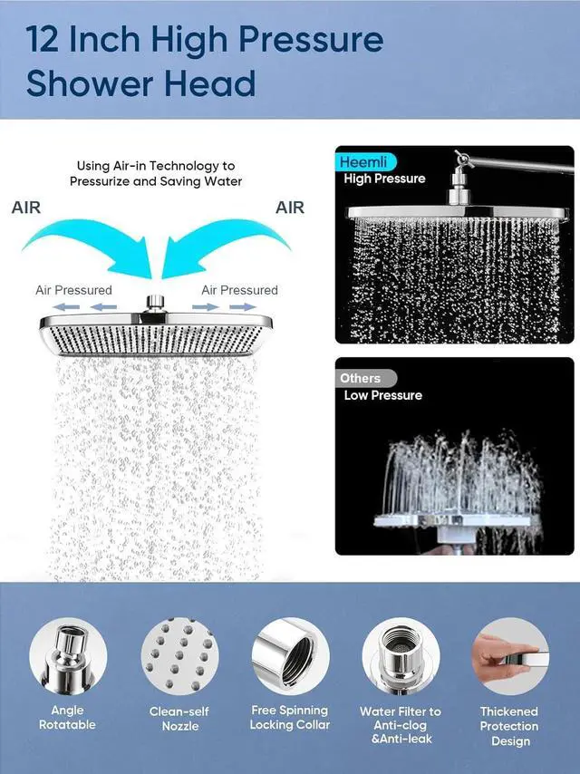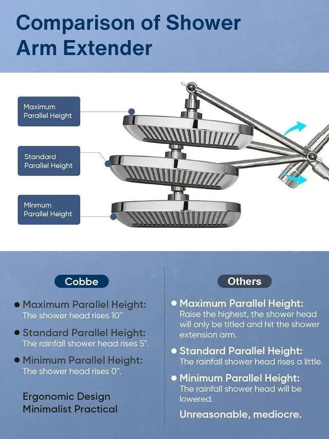 Adjustable Extension ArmHeemli shower arm is equipped with adjustable rotary ball connector, the height can be adjusted up and down, so that your large shower can be adjusted at any Angle, do not hit the shower arm, enjoy the luxury shower experience!