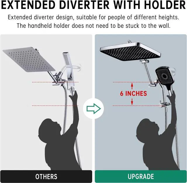 UNIQUE METAL EXTENDED DIVERTER WITH HOLDER: The unique metal extended diverter switch allows you to adjust the mode without having to lift your arm hard. The handheld shower holder does not need to be glued to the wall, it is convenient to reach the handheld device. G1/2 universal connection for most standard U. S. bathroom plumbing
