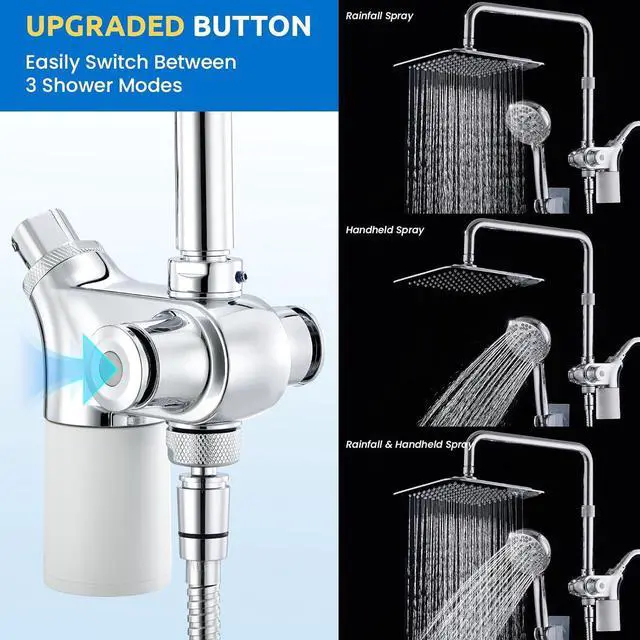 Upgraded 3-Way Diverter Valve: Easily switch between 3 shower modes with the upgraded button that has passed 250, 000 rigorous push tests, enhancing its lifespan. Choose between rain shower head, handheld shower head, or dual shower heads to meet the needs of every family member.