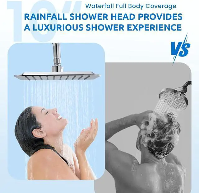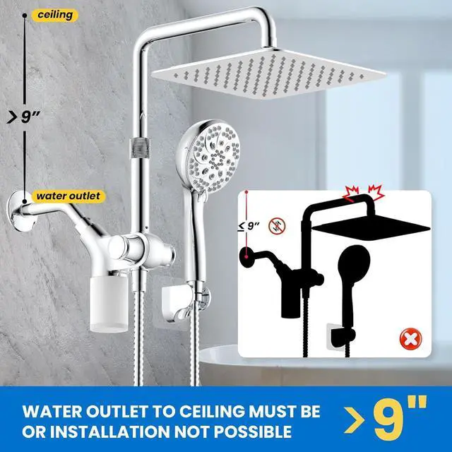 Easy Installation: Package includes 10" rainfall shower head, L-shaped shower column, 3-way diverter with filter cartidge, sealing cover, handheld shower head and holder, 59" hose, water filter, hex key, spare washers and screws, instruction manual, you can watch the installation video, no plumber needed. Please ensure that the distance from the outlet pipe to the ceiling 9"