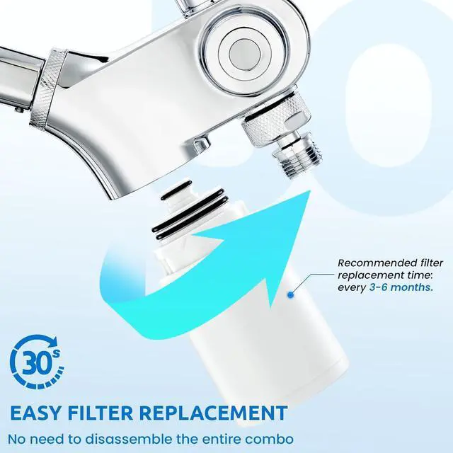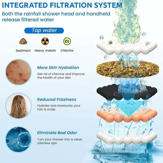Integrated Filtered System: Both rain shower head and handheld shower head can release filtered water, blending KDF-55 technology with VC Balls, Calcium Sulfite Balls, Carbon Balls and McFee Stone Balls, help remove the sediment, heavy metal and chlorine in the tap water, providing your family healthier and cleaner water. Easy to replace filter cartidge, no need to disassmble the entire dual shower head combo.