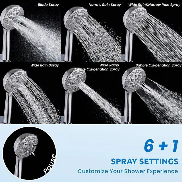 7 Settings Handheld Shower Head: providing blade spray, narrow rain spray, wide rain&Narroow rainspray, wide rain spray, wide rain&bubble oxygenation spray, bubble oxygenation spray and pause spray settings. Made of high quality ABS material, with a 59" stainless steel hose and shower head holder meet your shower needs.