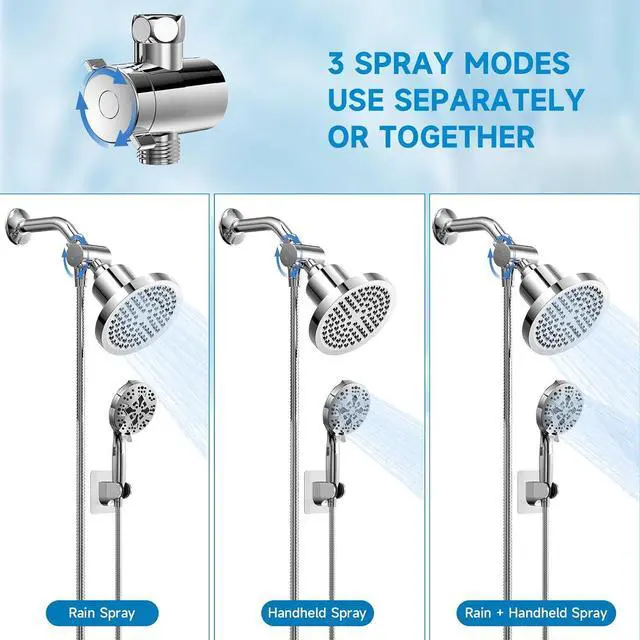 Shower Heads With Handheld Spray Combo SetThe dual shower head set with chrome surface make it look stylish and sophisticated, making your bathroom look more advanced and fashionable. The 6-inch rain shower head and 5-inch handheld shower head are made of high-grade ABS environmentally friendly material, which is not only durable and rust-proof, but also the showerhead set is lightweight and has high toughness.
