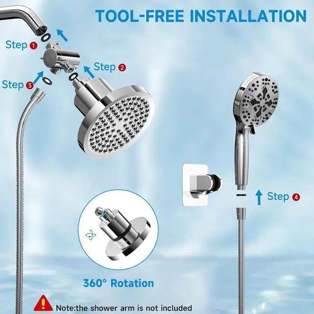 Easy Installation Without ToolsNo drilling required, no need to call a plumber. It also gives you a nice DIY experience. After installing, it will help your entire family to create a better shower hygiene and cleaner shower environment. Fits any standard shower arm.