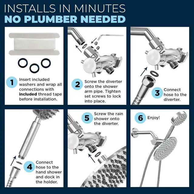 INSTALL IN MINUTES you need no prior plumbing experience for installation of our metal shower head! Read our EASY-TO-FOLLOW INSTALLATION INSTRUCTIONS, use the thread tape (comes with the shower head), screw onto your existing shower arm, and install in max. 10 min.