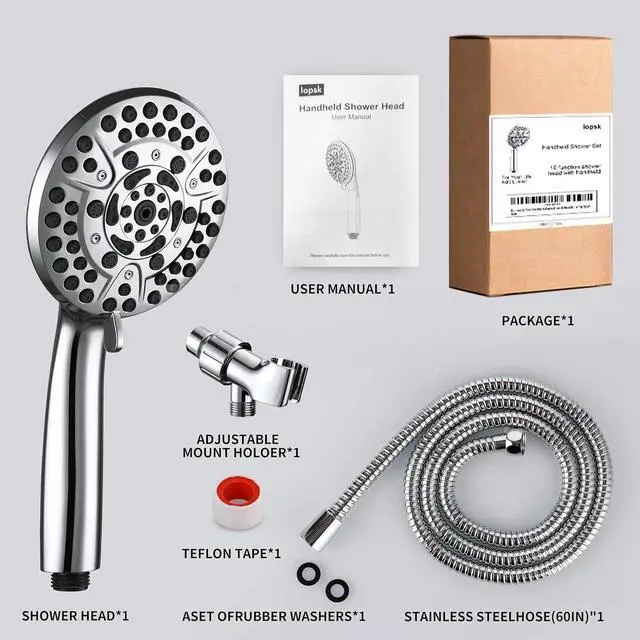 5-Min Tool-Free InstallUniversal 1/2" connector fits all shower arms. Complete kit includes 60" stainless steel hose, Teflon tape, and adjustable rust-proof brass bracket. No plumbing skills needed.