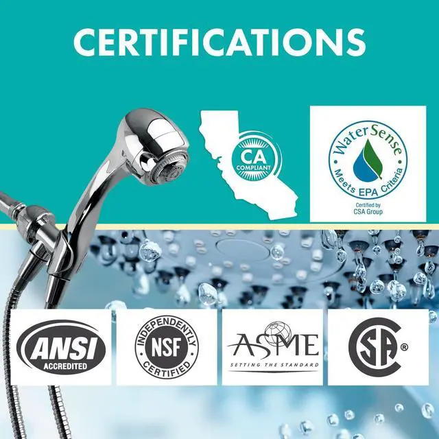 CORROSION RESISTANT AND WATERSENSE COMPLIANT: High impact-resistant polycarbonate thermoplastic is also used in the construction of our bathroom shower heads. This gives you added toughness and helps fight corrosion. Our efficient and cost-saving showerhead is ANSI certified, NSF certified, ASME listed, CSA listed, and Watersense compliant in EPA criteria in water efficiency.