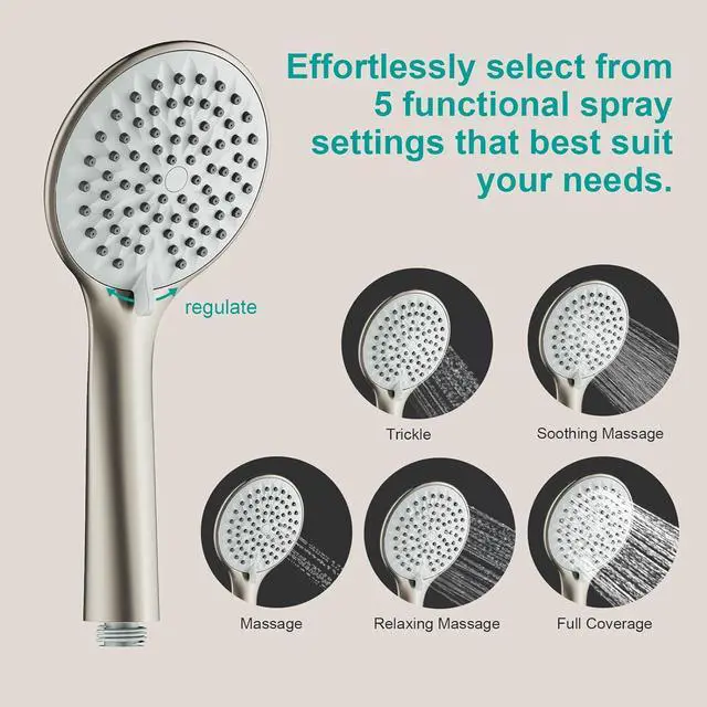 [Package Included] The package includes a 5-function handheld showerhead, a 59" (150cm) double interlock spiral hose, sliding bar, a shower holder, a hardware pack, and a detailed installation guide. It is designed for wall mounting installation.