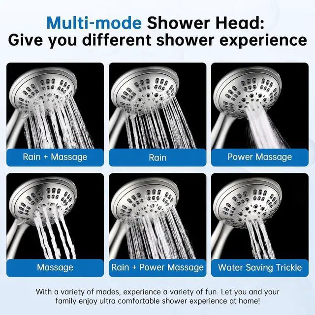 It' s 6 setting: Rainfall, Power Massage, Rainfall+Power Massage, Massage, Rainfall+Circular Massage and Water Saving trickle modes, provide you multiple unparalleled shower experiences. With this shower head, you can enjoy a wonderful Spa shower at home everyday