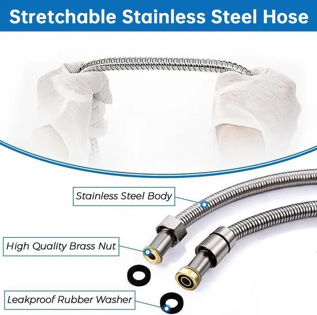 LONG FLEXIBLE 304 STAINLESS STEEL HOSE: 70" stretchable to 75", allows you a wider shower range, it' s easy for you to shower yourself, bath your babies, your pets or cleaning the toilet. A good quality hose refuses winding
