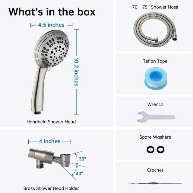 PACKAGE INCLUDES: Handheld Shower Head, Brass Shower Head Holder, 70" ~75" Shower Hose, Teflon Tape, Wrench, Crochet and Spare Washers