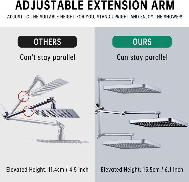 13 INCH EXTENSION ARM WITH LOCKING JOINT: Compared with the ordinary extension arm on the market, our extension arm allows you to easily raise or lower the position of the shower head according to your needs, tighten the locking connector after adjusting to the height that suits you, and say goodbye to the trouble of bending over to wash your hair