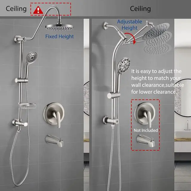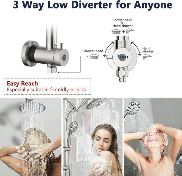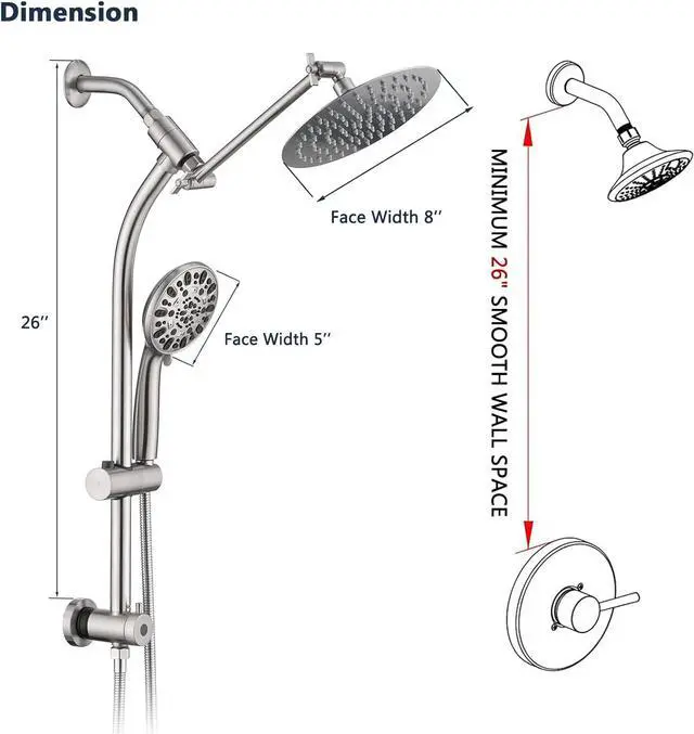 Drill-free Slider Bar: Slide bar shower combo can adjust height to accommodate both kids and adults, low 3-way water diverter & slide bar for easy reach, MUST HAVE MINIMUM CLEAR 26" VERTICAL WALL SPACE BETWEEN OVERHEAD SHOWER ARM AND MIXER VALVE