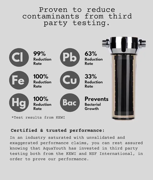 CERTIFIED & TRUSTED PERFORMANCE: In an industry saturated with unvalidated performance claims, you can rest assured knowing that AquaYouth has invested in third party testing and certification. The AquaYouth 2.0 shower filter is the only shower filter on the market that is NSF/ANSI 177 certified for the reduction of Free Available Chlorine and NSF/ANSI 372 certified for Low Lead Content Verification and confirmed the reduction of heavy metals by Korea Environment & Water Works Institute.