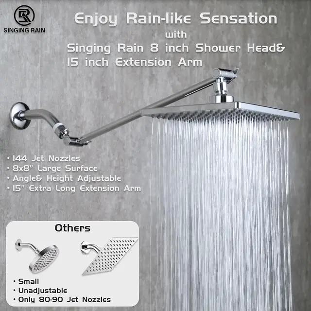 [Durable and Solid Quality] Singing Rain products provide superior durability and solid quality. Our shower heads and shower arms are crafted with high-grade material and have a sleek, modern design. Every single product is manufactured and tested at our local facility to ensure sealing performance before being sent to our customers. With Singing Rain, you can enjoy a luxurious shower experience that will last for years to come.