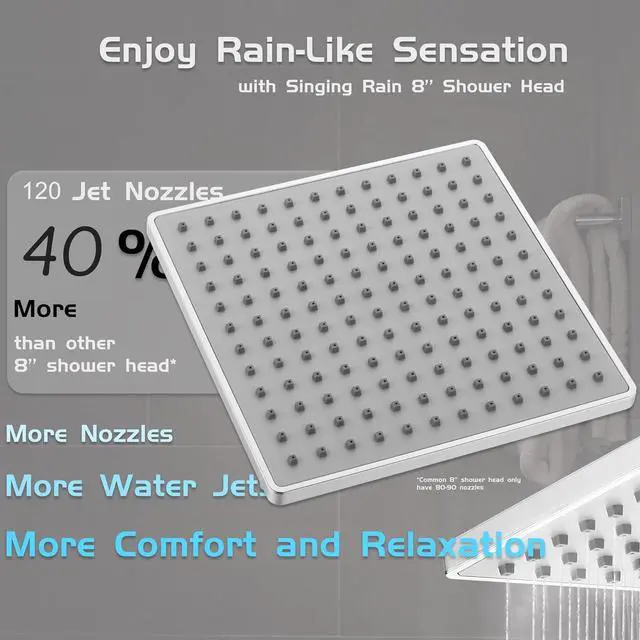 [Excellent Waterfall] The Singing Rain shower head is an excellent choice for those who love a powerful waterfall shower. Its nozzles are made from soft and easy-to-clean silicone. The square-shaped face is filled up with 120+ jets, 40% more than an ordinary 8' ' round-shaped shower head. It could provide you with a more comfortable and larger surface coverage shower experience. Enjoy the soothing rain-like sensation of the Singing Rain shower head!