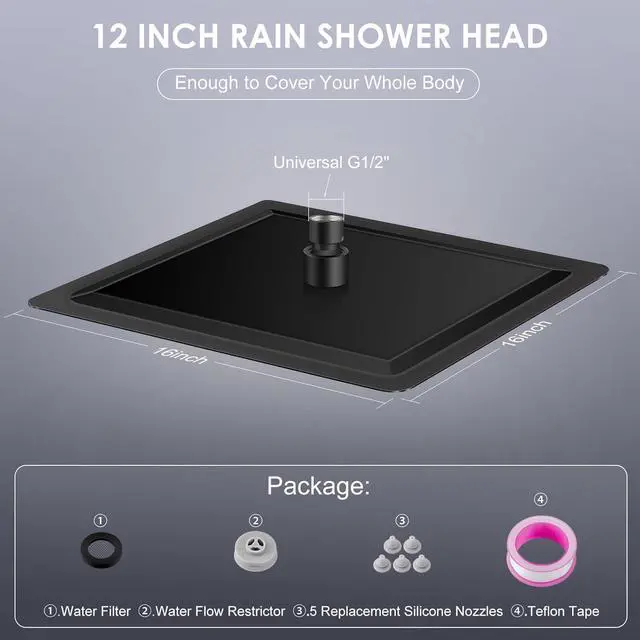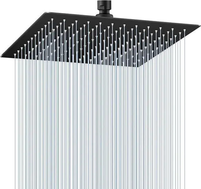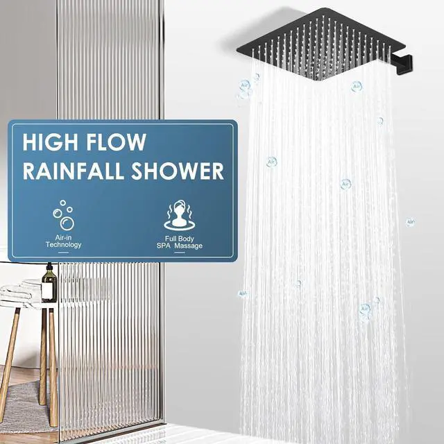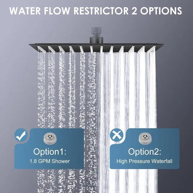 RAINFALL SHOWER HEAD - The 12 inches Square bathroom waterfall showerhead ceiling or wall mount, engineered with 1/13" ultra-thin design and innovative air-in technology, feeling you a ultimately spa shower. With the included flow restrictor, experience a gentle 2.5GPM rainfall, or remove it for a higher pressure waterfall shower, catering to your preferences.