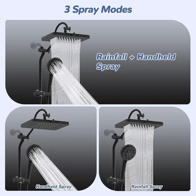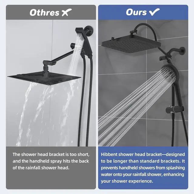 [Upgraded Curved Shape Extension Arm with 3 Way Diverter] The Hibbent shower arm is crafted from long-lasting all-metal material, ensuring strength while preventing leaks and wobbling, It is equipped with upgraded curved shape shower arm which allows you to raise or lower the shower head while keeping it in a horizontal position, preventing any collisions with the arm. The 3-way diverter shower arm offers a versatile combination of four spray modes: Handheld Spray, Rainfall Spray, Rainfall + Handheld Spray, catering to all your showering needs