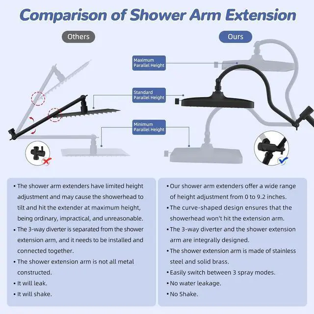 [ 9.8 Inch Stainless Steel Sliding Bar with Showerhead Holder] The shower sliding extension bar is crafted entirely from metal, it boasts top-notch quality that guarantees long-lasting performance, standing up to daily use without scratching or losing its shine. The 9-inch adjustable height range allows you to customize the placement of the handheld showerhead to suit users of all heights, reducing the frustration of a handheld showerhead thats out of easy reach. The angle adjustment feature allows you to precisely direct the water flow to any position you desire, ensuring water flow precisely targets hard-to-reach areas like your back and feet