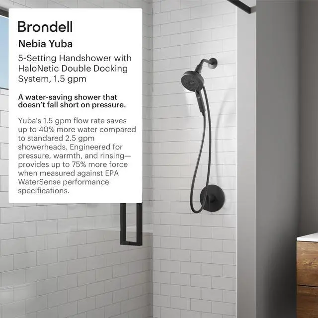 PATENTED NEBIA SPRAY TECHNOLOGY: Yuba delivers up to 40% more water savings compared to a standard 2.5 gpm showerhead and sprays with up to 75% more force when measured against EPA WaterSense performance specifications