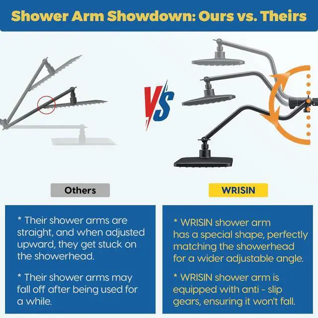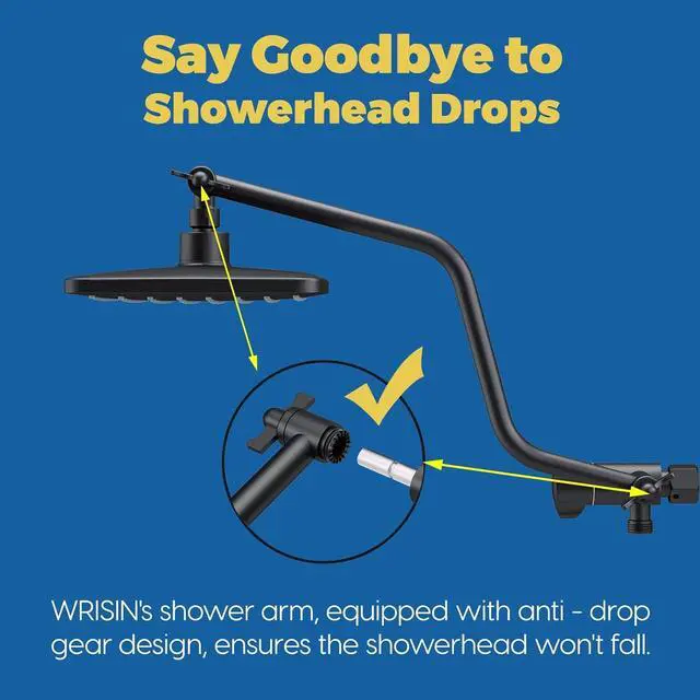 Rainfall Shower Head Drops: WRISIN' s Adjustable Shower Extension Arm, equipped with a gear design, ensures the showerhead won' t fall.