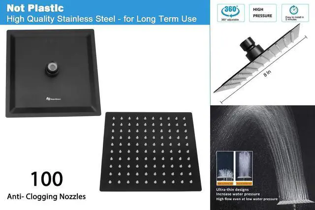 STAINLESS STEEL SHOWER HEAD: NearMoon Shower Head is ultra-slim and stylish with 8 inch; The shower head is 100% heavy duty solid stainless steel, with the highest rust resistance; 100 silicone nozzles; With the swivel ball connector you can adjust and fix it to any angle you like