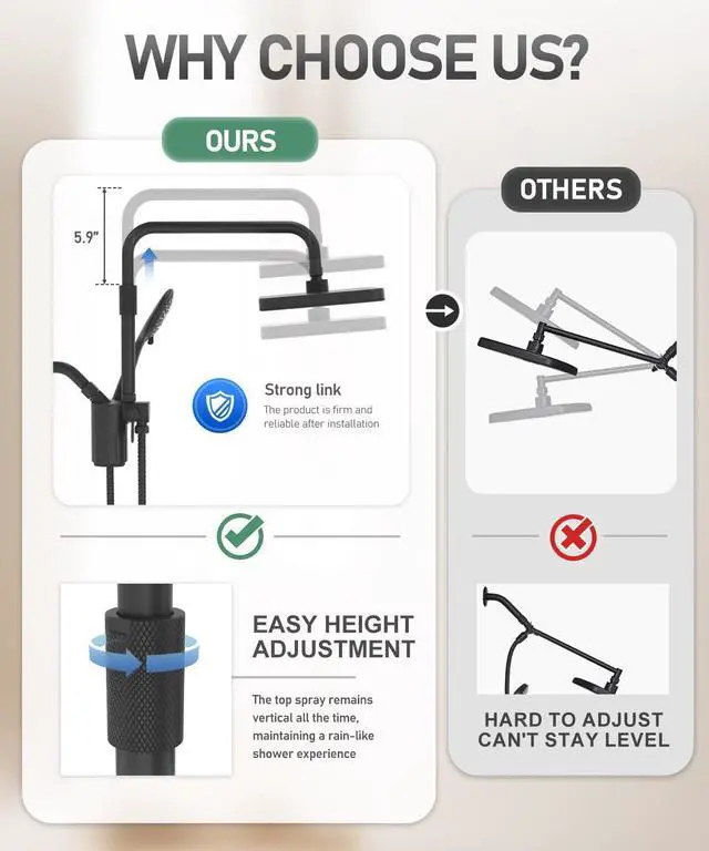 [Upgraded 13.3 -inch extended arm]-Its unique design provides a rain shower experience. Compared to ordinary shower arm extensions, the shower arm extension can raise and lower the shower head while maintaining its horizontal position. This ensures that the shower head remains vertical at all times, preventing it from colliding with the arm and avoiding the slanted water flow that occurs with ordinary straight arm extensions.