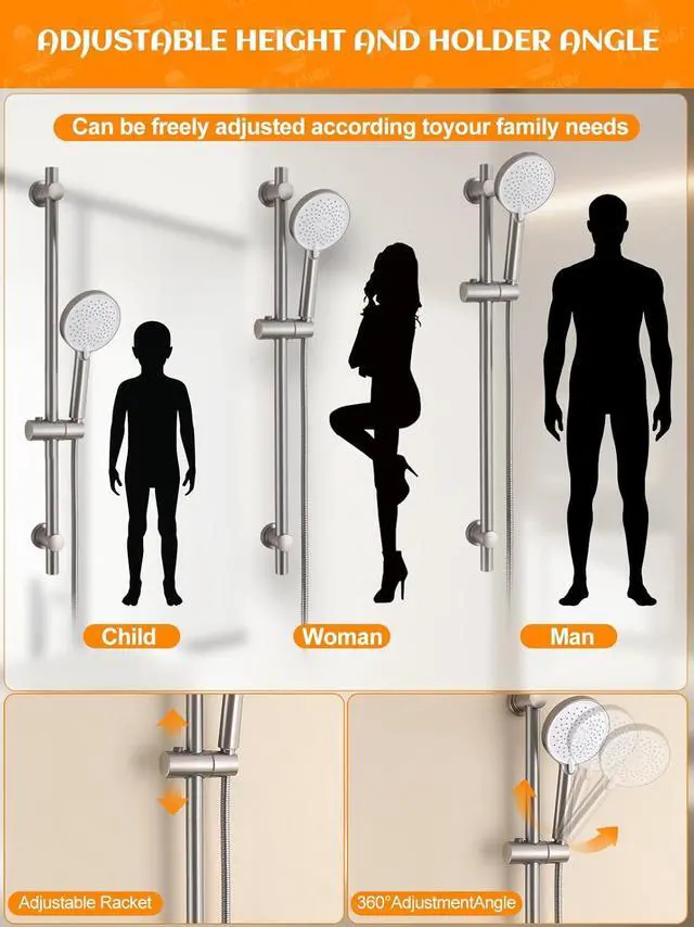 ADJUSTABLE SHOWER SLIDE BARTired of struggling with a fixed showerhead thats too high or low? The RALANDA Handheld Shower Head with Slide Bar solves that problem. Easily adjust the height and angle for every family membereven pets and kids. With up to 30 inches of adjustment, it ensures a perfect, comfortable shower experience for everyone