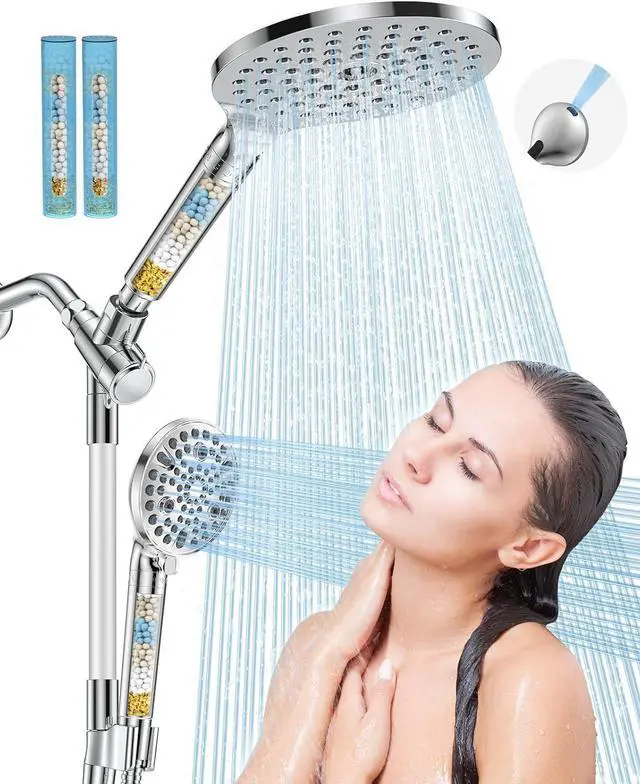 Filter: This showerhead combo includes a 8 inch rainfall handheld shower head and a 7-setting high pressure handheld showherhead. Unique pre-installed filter material in the 2 shower heads helps to filter and purify the chlorine, fluoride, heavy metals in the unfiltered water and improves the condition of your skin, hair and snail effectively