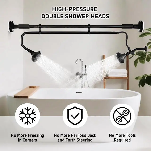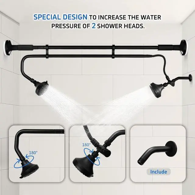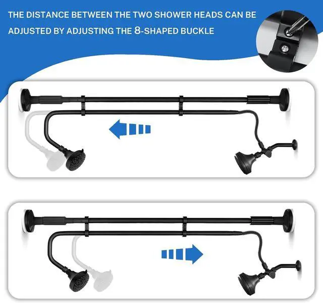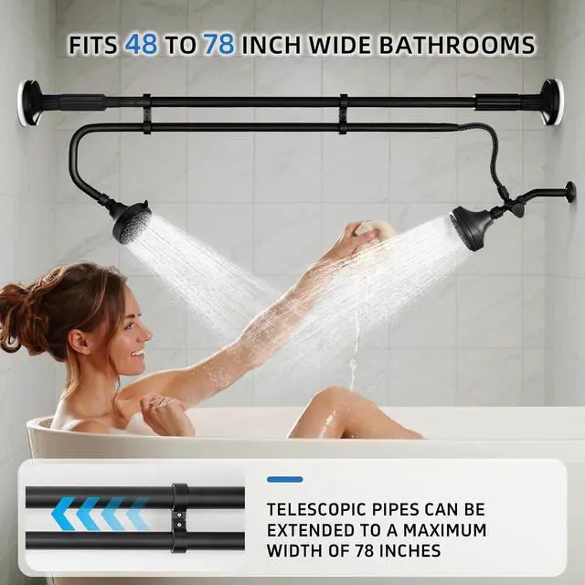 ADJUSTABLE FOR MOST BATHROOM SIZESOURBAOFU dual shower head system fits perfectly in shower spaces between 48 to 78 inches wide. Adjustment is made through the telescopic rod, and the 2 " 8" buckles can be adjusted left and right at will, providing maximum flexibility to ensure that your shower area stays balanced and centered. OURBAOFU shower heads are more suitable for your bathroom needs than other fixed-mounted shower heads. No drilling or remodeling required