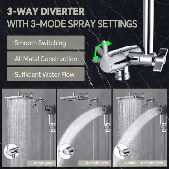 3-Way Diverter with Front-Oriented Switch: Our diverter allows seamless switching between the dual shower head, or both simultaneously. The front-mounted switch design offers easy accessibility and smooth control, enhancing your convenience.