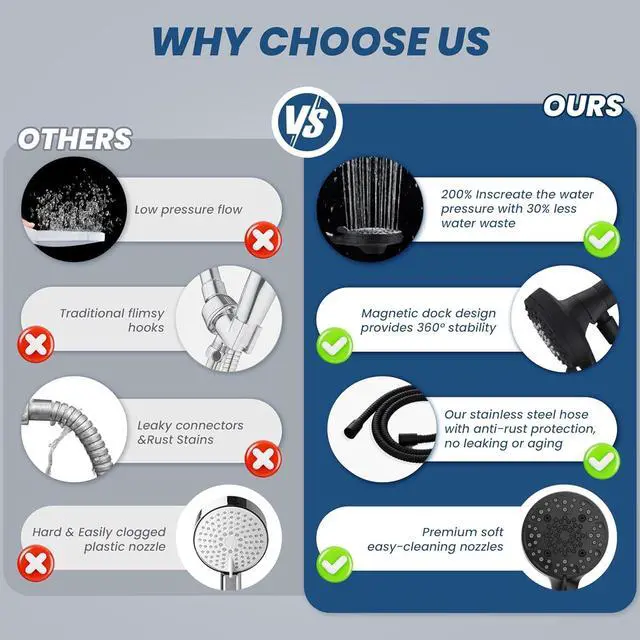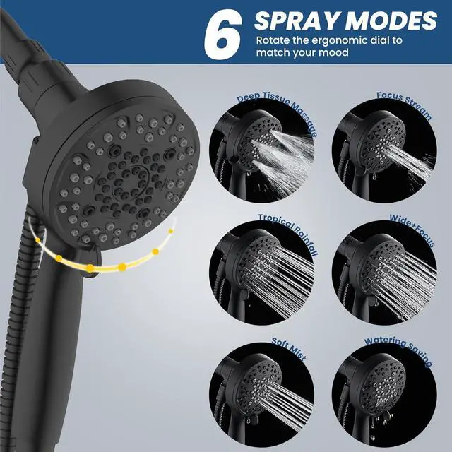 High Pressure Handheld Shower Head: This matte black magnetic shower head with high pressure flow rate that delivers targeted high-pressure streams with 30% less water waste. The soft easy-cleaning nozzles resist hard water clogging, ensuring consistent high-pressure flow for a spa-like rinse