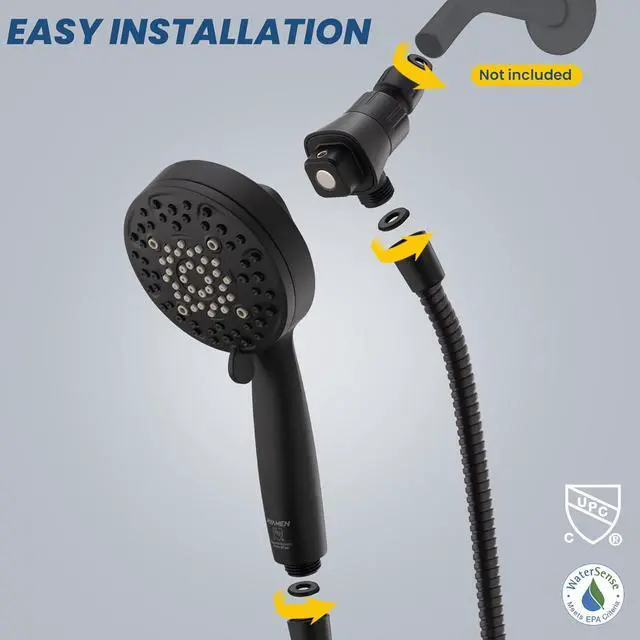 Easy Assembly & Tool Free: With G 1/2 thread, no tools and plumber needed, package includes detachable handheld shower head, 70" stainless steel hose, magnetic dock, rubber washer, installation guide. It is easy to install within five minutes