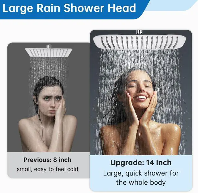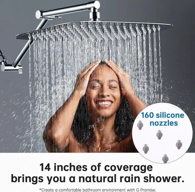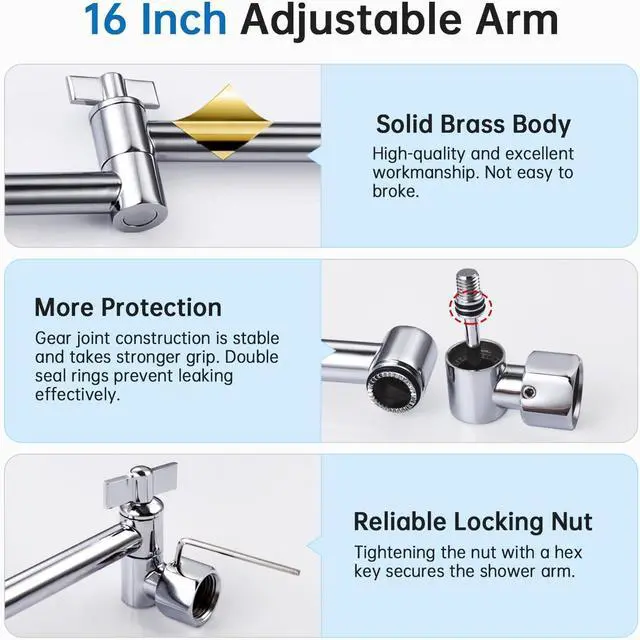 16-INCH SOLID BRASS EXTENSION ARM: You can adjust the height and angle of the showerhead through two knobs to meet your specific needs. The free-spinning locking collar allows you to tighten it in a right place. We thickened this arm, and the diameter is larger, the arm is stronger, so it will not bend during installation