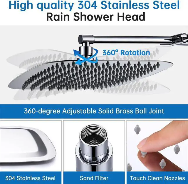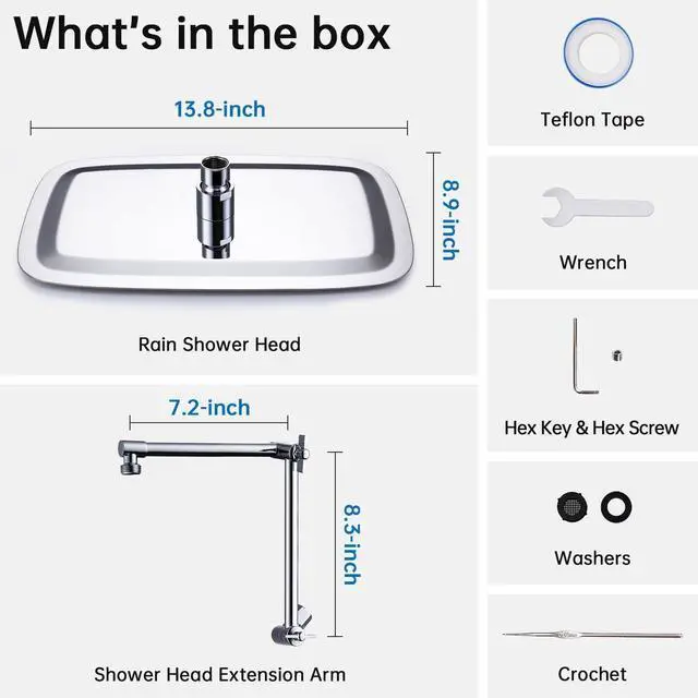 PACKAGE INCLUDES: Fixed shower head, shower extension arm, accessories