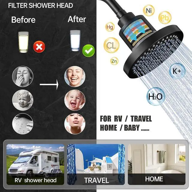 WATER FILTRATION: Removes chlorine and fluoride, heavy metals and other deposits. This shower head water softener keeps bathing children and pets comfortable and safe. Our Vitamin C and E shower filter prevents eczema, dry skin and dandruff