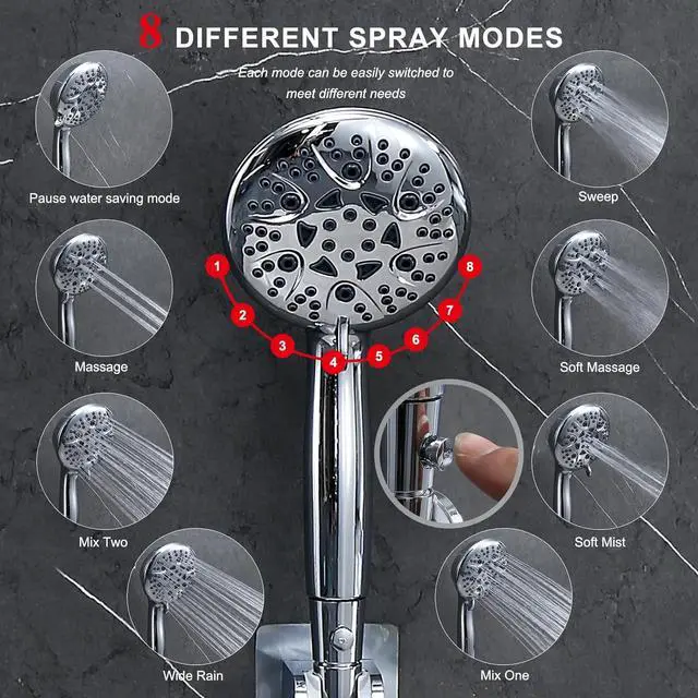 8 Spray Modes - BSTHAONE Handheld Shower Heads spray has 8 shower modes: Massage watermassage water + granular watergranular watergranular water + shower waterouter ring shower waterinner ring shower water + outer ring shower waterinner ring shower waterpause water