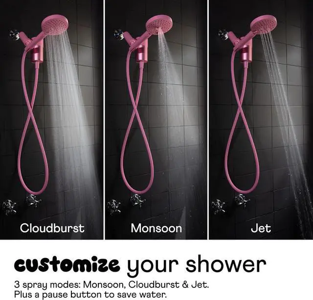 CUSTOMIZE YOUR SHOWER EXPERIENCE WITH 3 SPRAY MODES - Monsoon for full coverage, Cloudburst for a relaxing rainfall, or Jet for a strong massage. A built-in pause button lets you reduce water flowideal when washing kids or pets to save water.