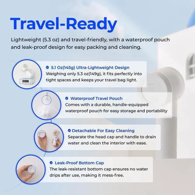 Ultra-Lightweight & Portable Design Weighing just 0.32 lbs, this mini shower head is smaller than a water bottle and easy to carry, making it the ideal travel companion for any suitcase or backpack.