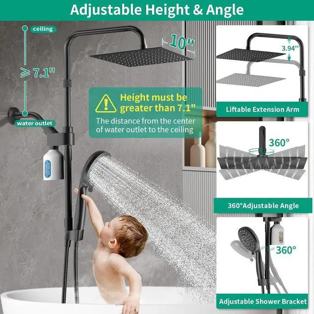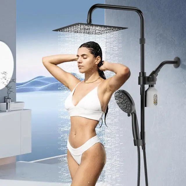 10" Rainfall Shower Head10" large square panel design that provide full body coverage of water flow, allowing you to enjoy a waterfall shower experience. In addition, this double shower head with filters for hard water combo is equipped with a brass swivel joint and a liftable extension arm, so that you can rotate the square panel 360°and easily adjust the height of the shower according to your needs. This humanized design is ideal for children, women and men.