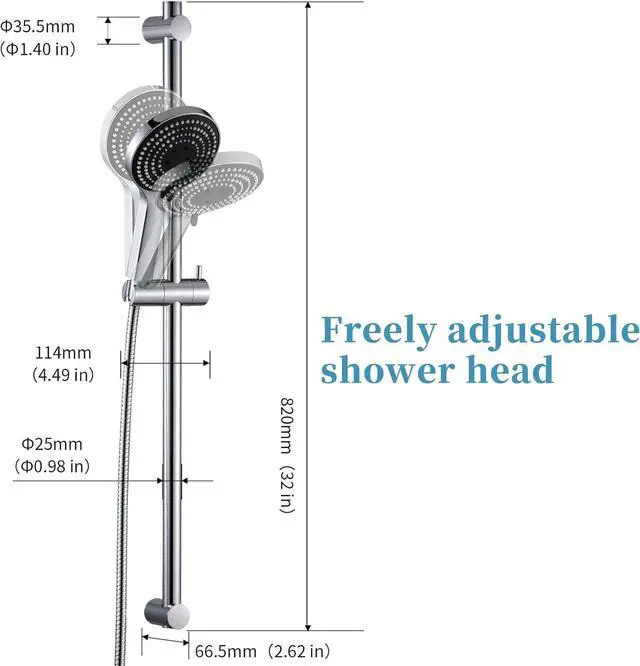 [Adjustable Shower Slide Bar] The 33 in slide bar with shower head holder makes it easy to adjust the handheld shower height, as the slide holder can freely move and get 360°rotation, flexibly meet the needs of each family member with different heights and shower angles. Made of ASTM 304 stainless steel is more stable and durable.