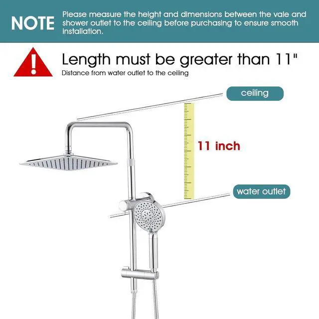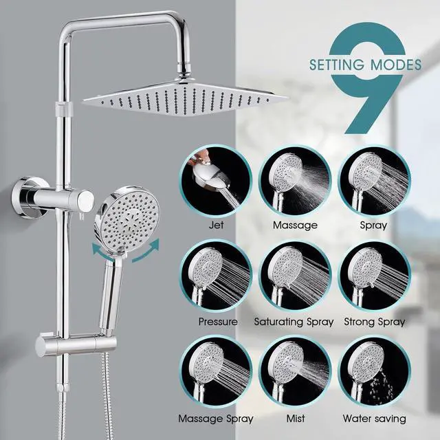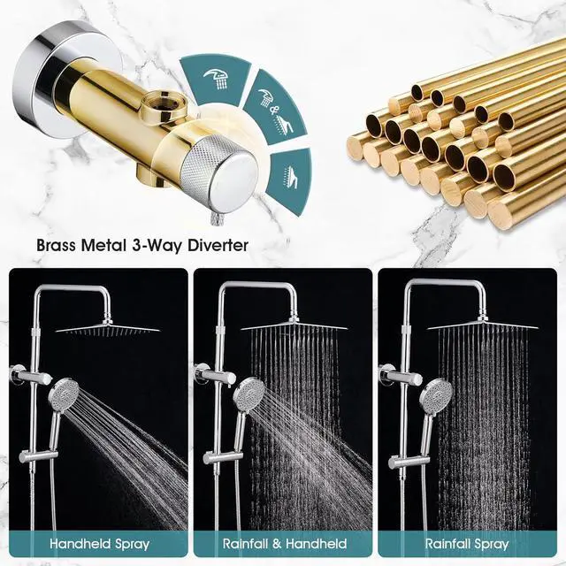Package Included: The package includes rainfall shower head, handheld shower head, main body with 3-way diverter, water inlet connectors, shower extension arm, shower slide bar, shower bracket, shower hose, hardware pack and detailed installation guide