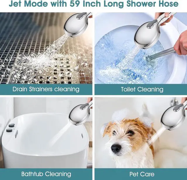 Handheld Shower Head with 9 Setting Spray: By simply pressing the back button, fan-shaped spray that cuts through grime in seconds, with shower hose extends your reach for a versatile clean, perfect for shaving, kids, pets, and the shower itself