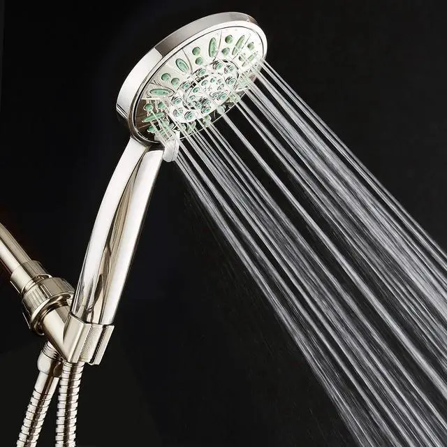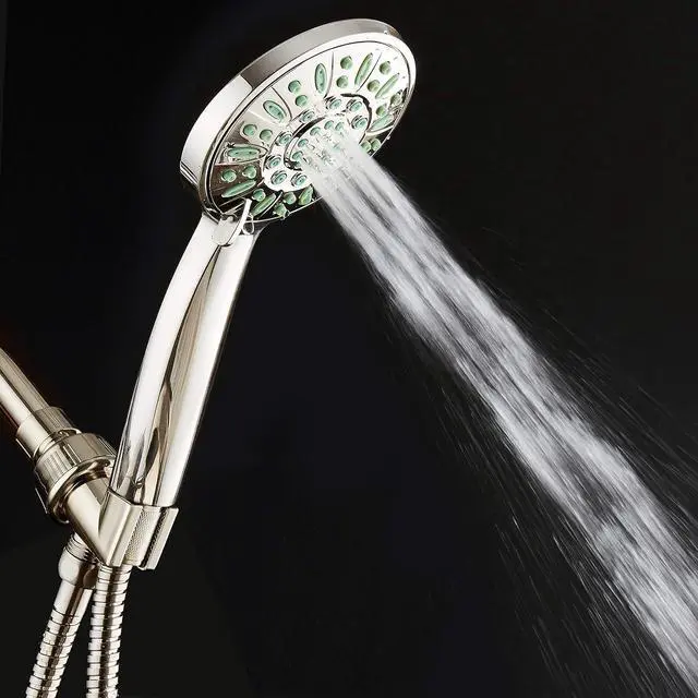 Jets & 6 settings: Power Rain, Pulsating Massage, Gentle Mist, Rain/Massage, Rain/Mist & Water-saving ON/OFF Pause. Includes Angle-adjustable Overhead Bracket, Stainless Steel Hose, Plumber' s Tape & LIFETIME WARRANTY. Premium Brushed Nickel Finish. EASY TOOL-FREE INSTALLATION