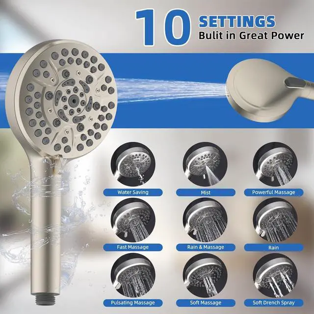Ten Settings Handheld Shower Head: The handheld shower head features ten different spray settings, designed with multi-stage, powerful, and replaceable filter cartridges. It offers 10 versatile spray modes to meet a variety of user needs, supported by sufficient water pressure. The 5-inch anti-dust showerhead face is easy to clean. Additionally, it includes a flow regulator that adjusts water pressure to accommodate varying conditions across different areas
