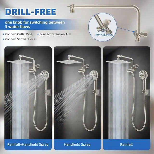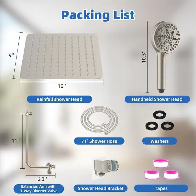 Shower Head Combo Includes: 10-inch square rainfall shower head, 10-spray handheld shower head, 71-inch stainless steel shower hose, 11-inch shower head extension arm, 3-way water restrictor, adhesive shower head holder, washer, and manual. Complete accessories and detailed installation instructions are provided. No need for a plumber, upgrade your bathroom by yourself; With a sleek Brushed Nickel finish, it fits well with most bathroom fixtures and decor styles
