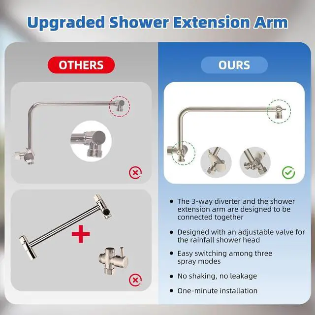 Upgraded 3-Way Diverter Valve: The 3-way diverter valve enables simultaneous operation of two showers or independent use of either the handheld or rainfall shower head. Designed to connect securely with the shower extension arm, this valve prevents leakage and shaking during use