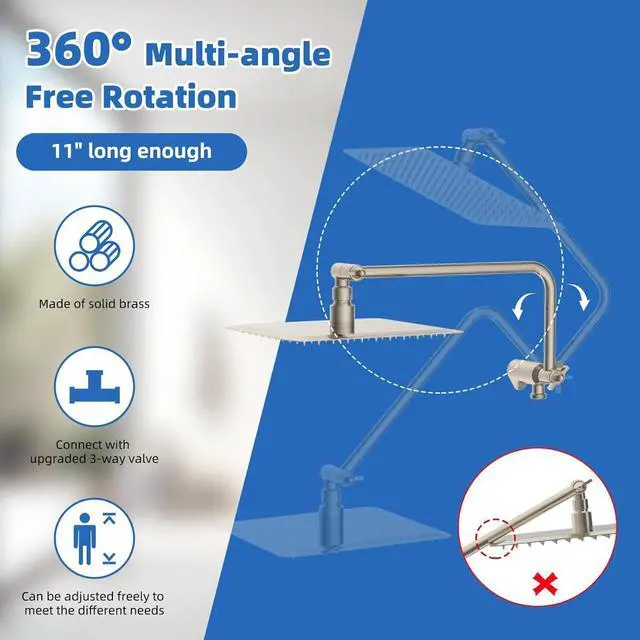 Shower Extension Arm of 11 Inches: The 11-inch shower extension arm is crafted from solid brass, offering excellent corrosion resistance for long-term use. It is compatible with both rain shower heads and handheld shower heads, featuring adjustable height and angle settings for optimal positioning